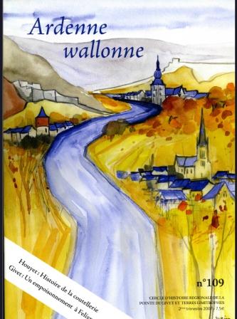 Le n°109 s’ouvre sur un important dossier qui concerne l’agréable village de Houyet dont P.Ledent offre en frontispice une vue printanière : « La coutellerie à Houyet ». Abondante étude qui inclut l’histoire de la coutellerie dans le Namurois, puis à Houyet, la description des ateliers du village et la technique nécessaire pour cette fabrication artisanale aujourd’hui disparue. D’abondantes planches tirées de l’Encyclopédie illustrent le nombre impressionnant d’instruments qui étaient nécessaires, et les couteaux divers qui pouvaient être fabriqués. A ces pages où revit l’artisanat local, rédigées par Michel Gilles, des Cahiers de la Lesse, s’ajoute un encadré, tiré du Bulletin communal de Houyet, où P.Melchior rappelle les liens entre la coutellerie du village et le roi Léopold I de Belgique.