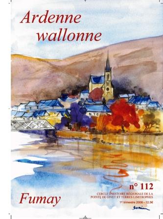 Le numéro 112 de notre revue est un numéro spécial entièrement consacré à la cité de Fumay. Ses 134 pages toutes en couleur décrivent l’histoire de la petite ville depuis les plus anciens textes (charte communale de 1222, donnée avec sa traduction et un commentaire rédigé en un cahier central), description de ce qui fut au cours des âges l’activité principale, les ardoisières, et les ouvriers qui les exploitèrent, avant d’aborder les autres aspects de la cité, sa vie religieuse, (grande église Saint-Georges, pèlerinage local de Diversmont, confrèries diverses), les exploitations forestières et la métallurgie, les grands hommes nés à Fumay, (peintres, chanteur, écrivains, syndicaliste, médecin-historien), textes poétiques et en wallon local (Ghislaine Caussin et Auguste Saladin), jusqu’aux sobriquets dont les anciens se souviennent bien ! Numéro dédié à Lucien Coupaye, historien local décédé après la dernière guerre, et à son fils Didier qui fut de longues années directeur de notre revue Ardenne Wallonne : c’est lui-même qui avait mis en route la rédaction de ce numéro dont les pages ont été en grande partie confiées à des rédacteurs locaux, Gontran et François Lorent, Claude Formal-Cailliez et Vincent Anciaux,Paul Maucort, Hervé Carn, enfin, enfant de la commune bien qu’écrivain émigré en Bretagne.