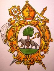 Le loup du blason (dessin Alain Sartelet) tire son origine de la pieuse légende de la fondation de l’abbaye mérovingienne de Stavelot par Saint-Remacle en l’an 648.