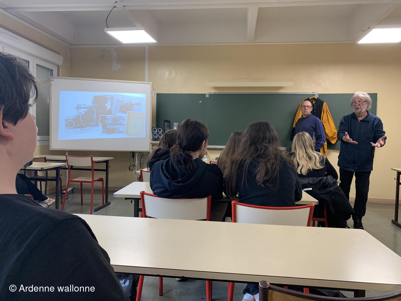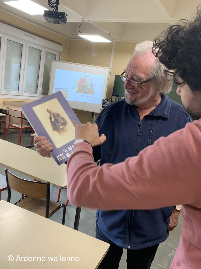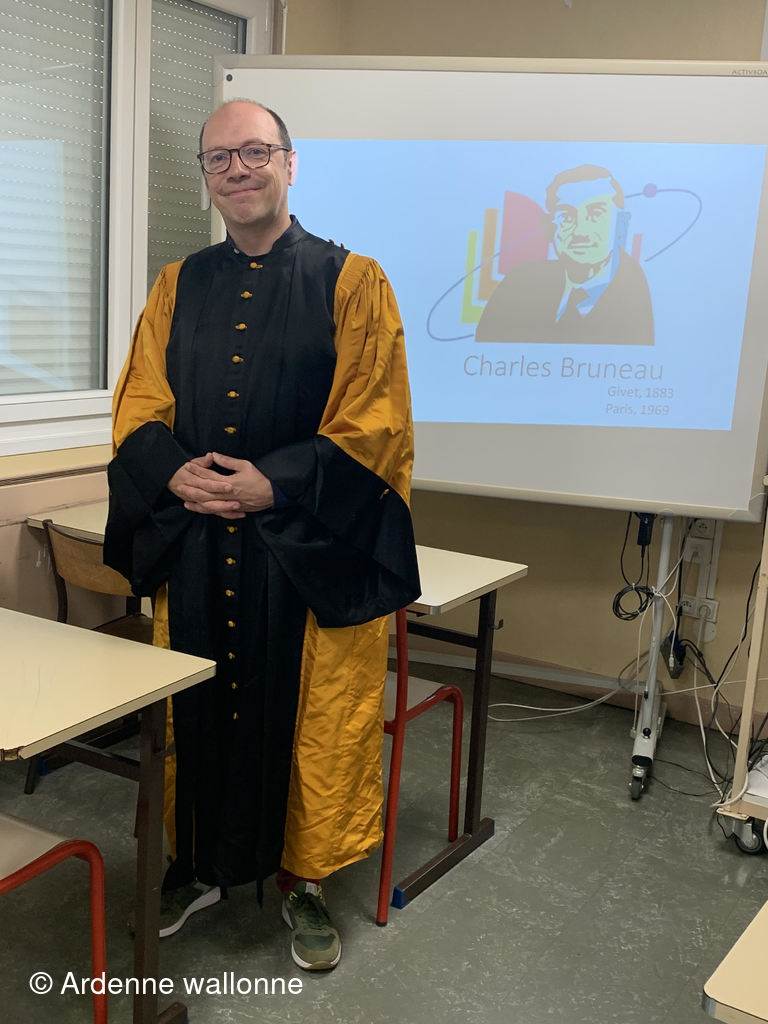 Accompané de Michel Tamine, Matthieu Quignard ,ingénieur linguiste et arrière petit-fils de Charles Bruneau, célèbre linguiste  d'origine givetoise , du début du XXème siècle, est venu faire connaître son aïeul au collège Charles Bruneau de Vireux Wallerand. Il a fait écouter aux élèves de quatrième et de troisième, les premiers  enregistrements faits dans les Ardennes et a apporté , pour l'occasion, la toge universitaire de Charles Bruneau.
